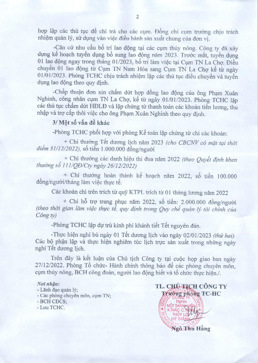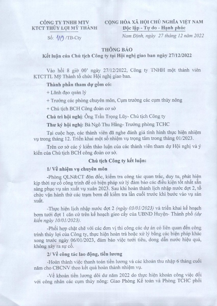 • Kết luận của Chủ tịch công ty tại hội nghị giao ban ngày 27/12/2022