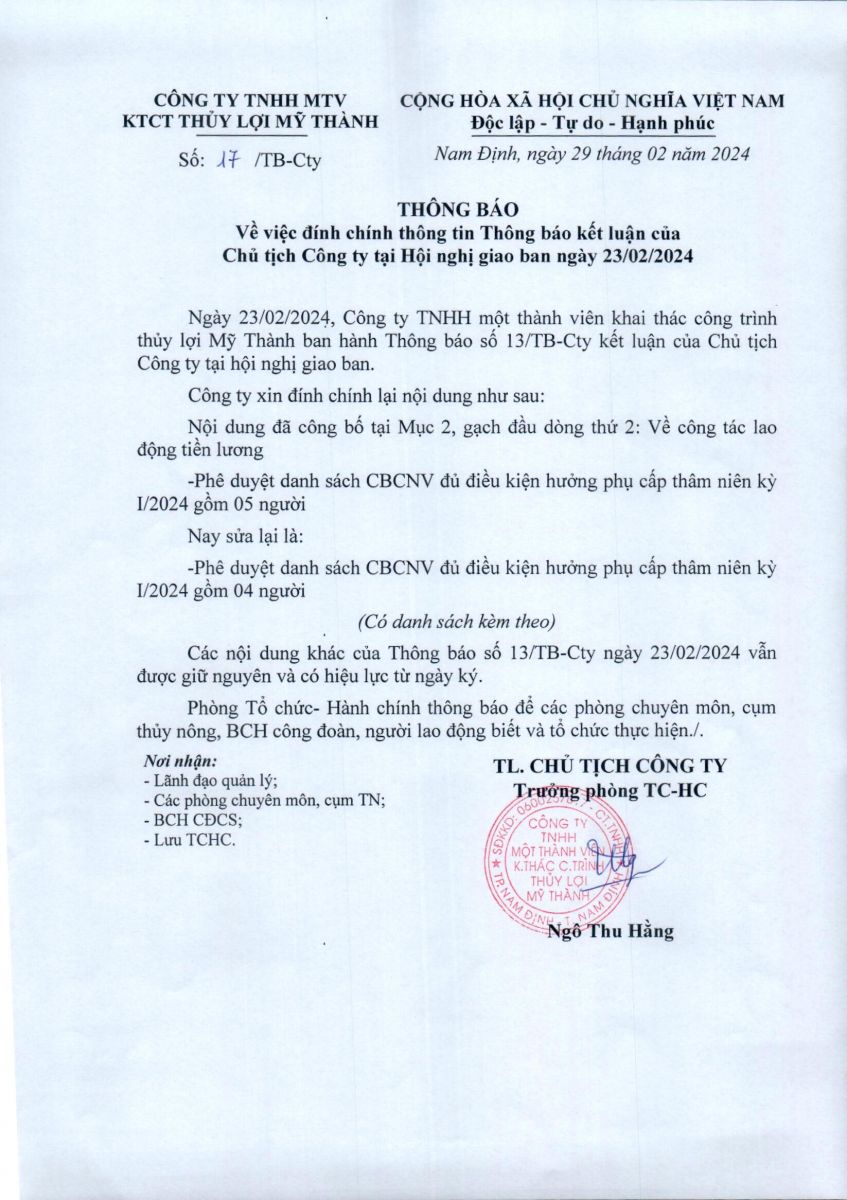 • Thông báo về việc Đính chính thông tin - Kết luận của chủ tịch công ty tại hội nghi giao ban ngày 23/02/2024