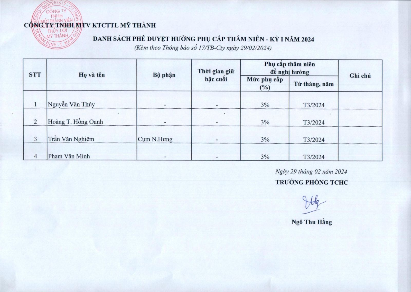 CÔNG TY TNHH MỘT THÀNH VIÊN KTCT THUỶ LỢI MỸ THÀNH