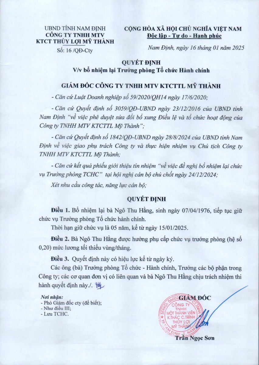 - Quyết định về việc bổ nhiệm lại chức vụ Cụm trưởng cụm thuỷ nông
