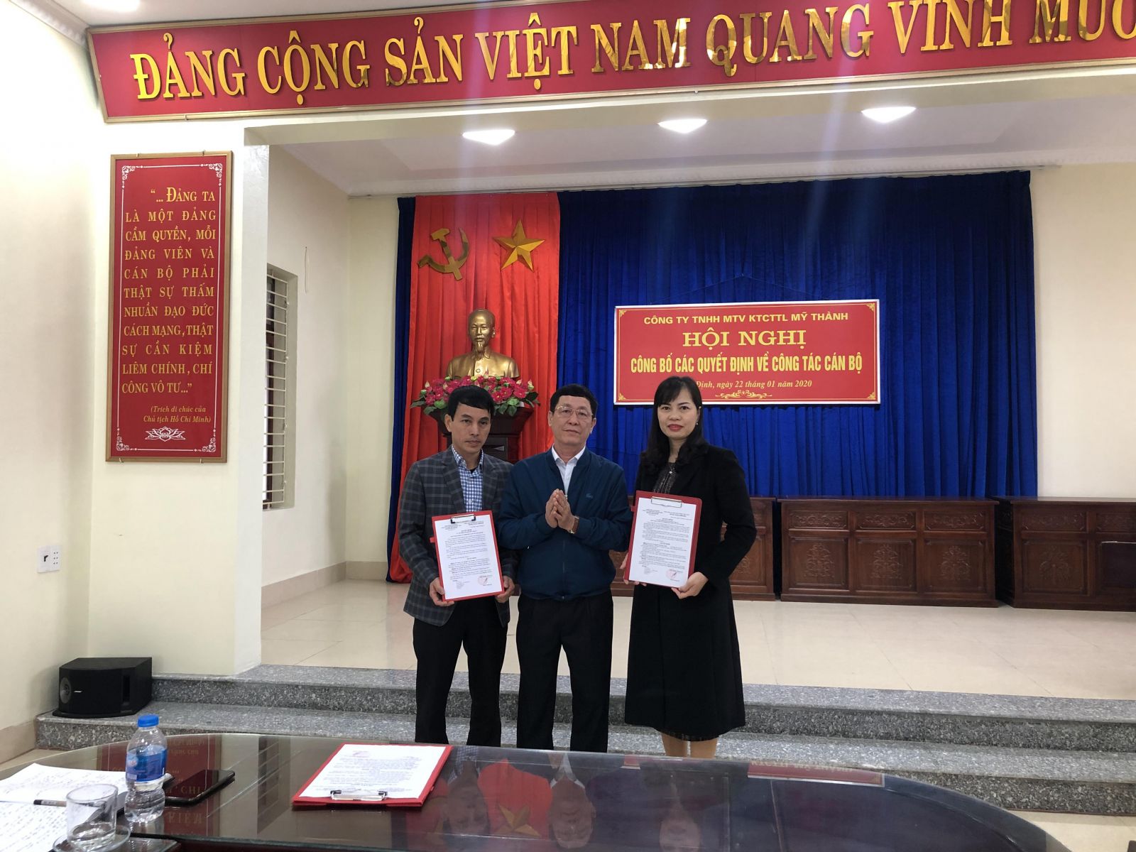 Tại hội nghị đã công bố quyết định số 05/QĐ-Cty ngày 20/01/2020 của Chủ tịch công ty TNHH MTV KTCTTL Mỹ Thành về việc bổ nhiệm PGĐ công ty đối với đồng chí Nguyễn Văn Dương, và quyết định số 05/QĐ-Cty ngày 20/01/2020 của Chủ tịch công ty TNHH MTV KTCTTL Mỹ Thành về việc bổ nhiệm kế toán trưởng công ty đối với đồng chí Nguyễn Thị Thu Lành. Đồng thời công bố quyết định số 07/QĐ-Cty của Giám đốc công ty TNHH MTV KTCTTL Mỹ Thành về việc bổ nhiệm trưởng phòng tổ chức hành chính công ty đối với đồng chí Ngô Thu Hằng