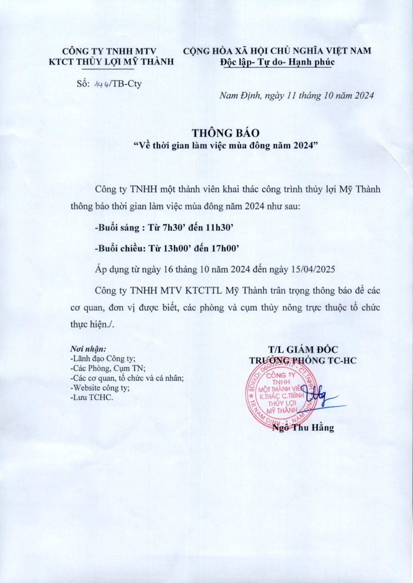 Thông báo về thời gian làm việc mùa đông năm 2025 10-10-2025