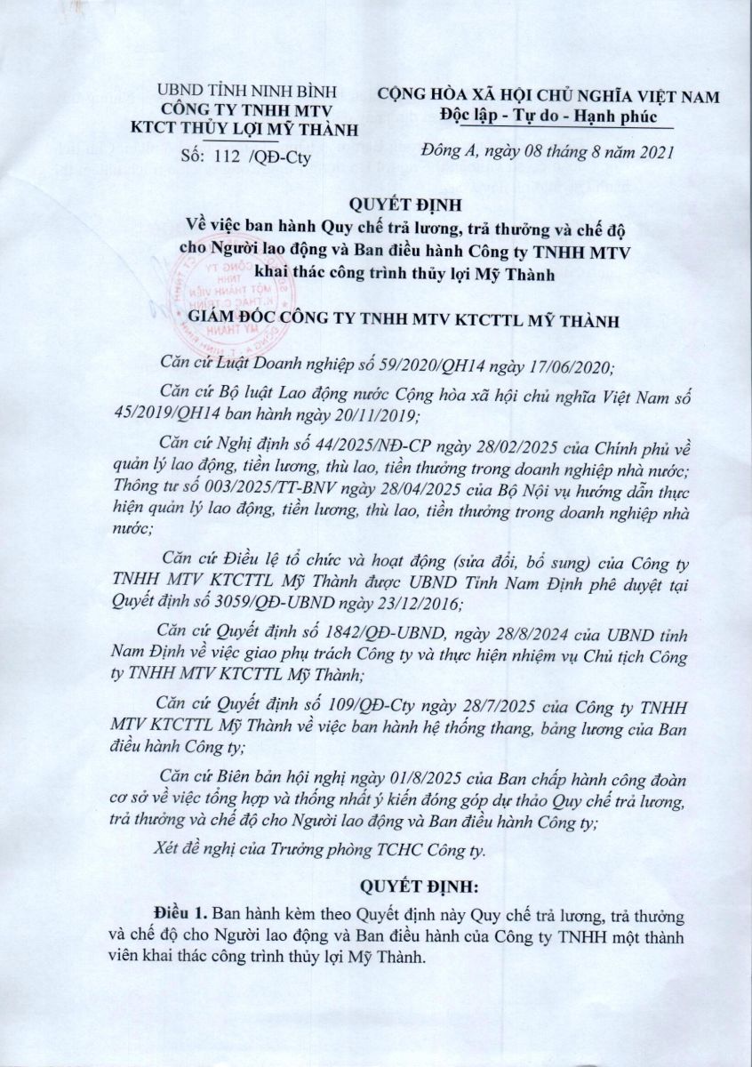 - Quyết định về việc phê duyệt danh mục, kế hoạch sửa chữa thường xuyên công trình thuỷ lợi năm 2026 của Công ty TNHH MTV KTCTTL Mỹ Thành